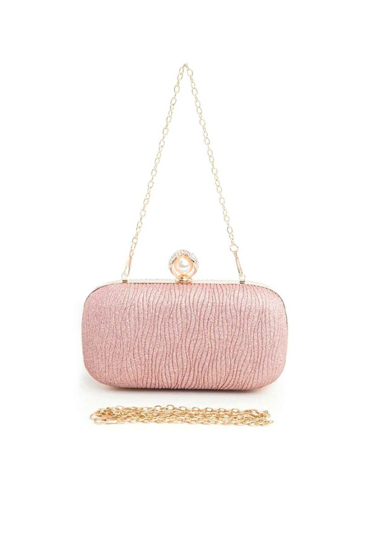 The Crystal Statement Clutch has smooth satin finish and adorned with sparkling crystal pearl style clasp. Whether paired with formalwear or styled as a statement accent, this clutch brings charm, glamour, and unforgettable detail to any ensemble.