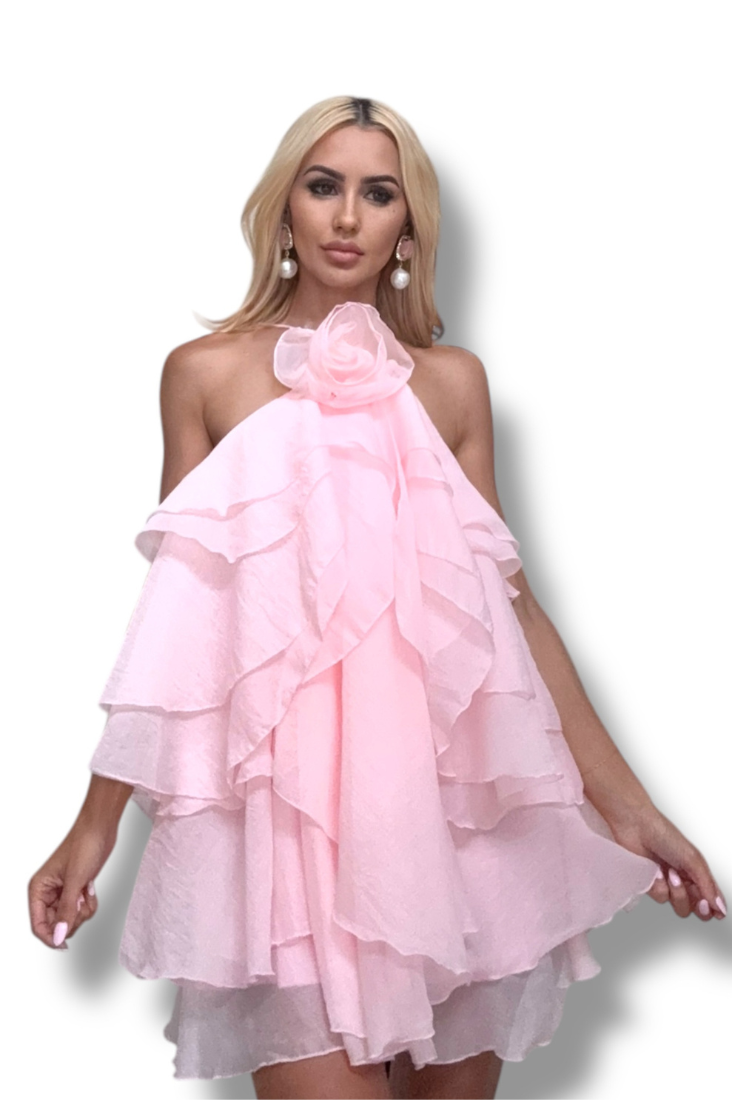 Soft, playful, and ultra-romantic — the Ruby Rose Ruffle Dress is a dreamy addition to your wardrobe. Designed with cascading layers and a bold rose detail at the neckline, its romantic, flirty and feminine. Perfect for weddings, garden parties, or special celebrations.