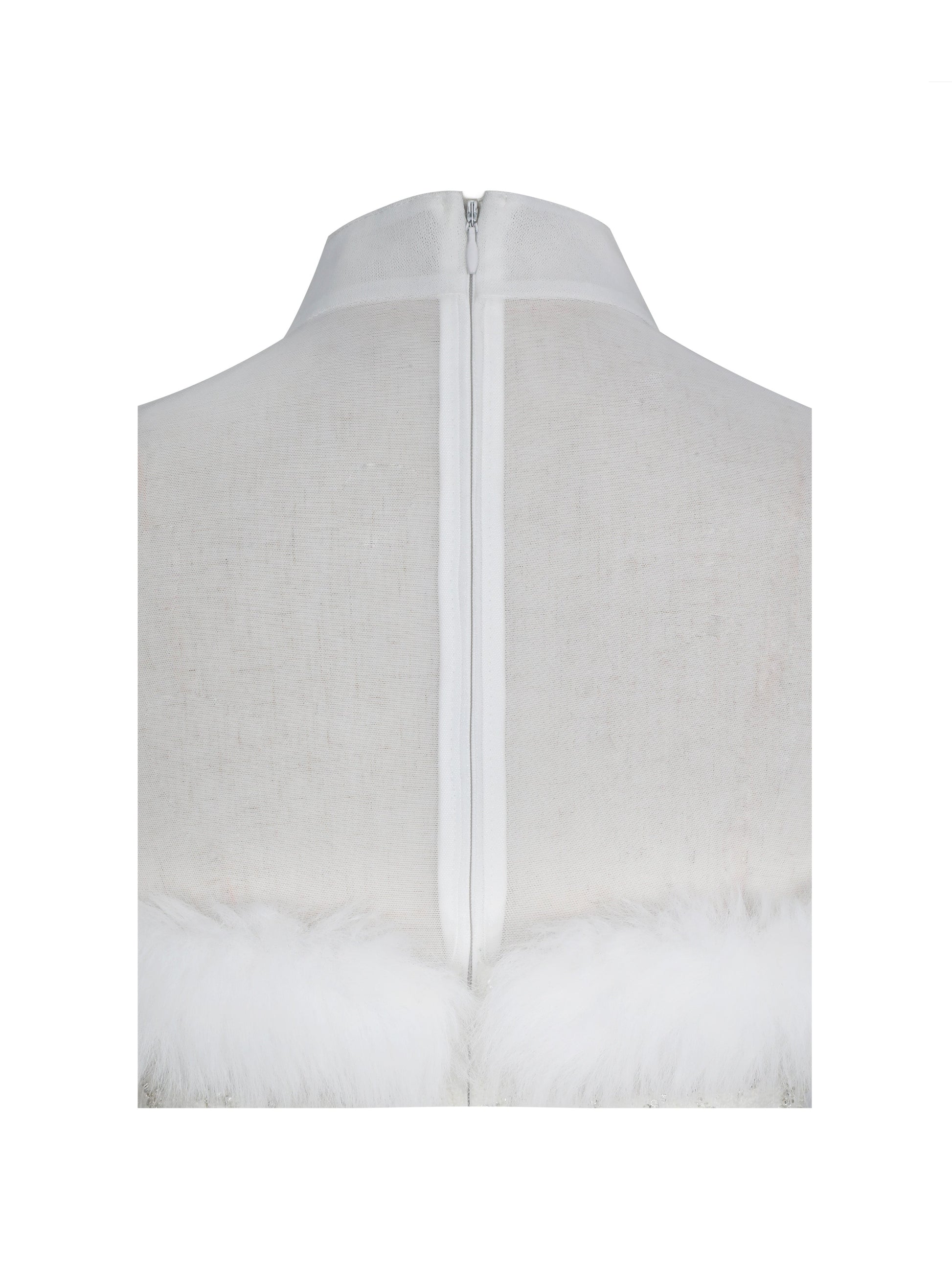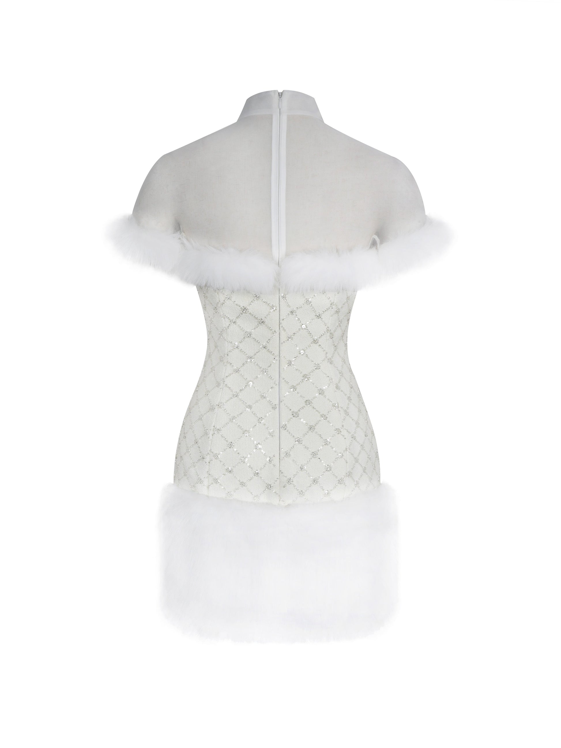 Step into a winter wonderland in the Taylor Dress, a snowy-hued mini that sparkles with seasonal charm. Crafted from ivory beaded boucle in a delicate crosshatch pattern, it features a turtleneck mesh underlayer with short sleeves and princess seams that sculpt the body beautifully. Plush white fur trims the bustline with subtle elegance, while a wide fur hem on the skirt brings cozy, playful movement. Finished with an invisible back zipper for a seamless fit, this dress is perfect for sipping hot cocoa at holiday markets, attending festive office parties, or twirling under twinkling lights at winter soirées — a truly magical choice for the most celebratory season of the year.